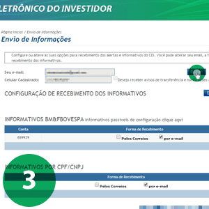 | Acesse https://cei.bmfbovespa.com.br, escolha a Itaú Corretora como sua intituição, preencha os campos com seu CPF e senha. Clique em "Entrar"; | Na página inicial do painel, clique em "Envio de Informações", no menu lateral esquerdo. | Na página seguinte, clique no botão "Editar" que aparece logo abaixo dos seus e-mail e telefone, ao lado de "Configuração de Recebimento dos Informativos". Depois basta selecionar a opção "Por e-mail" e clicar em "Salvar". |