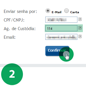 Na página seguinte, escolha a forma como quer receber a senha (por e-mail ou carta), insira seu CPF ou CNPJ, confirme o número da Agente de Custódia, que deve ser sempre 114 para a Itaú Corretora, digite seu e-mail e clique em Confirmar. |