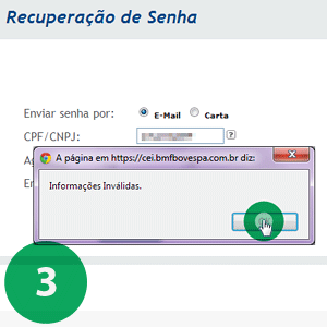 Caso tenha digitado seu e-mail corretamente e este seja o mesmo que consta em seu cadastro na BM&F, sua senha será enviada por e-mail (caso tenha escolhido essa forma de entrega).Importante: Caso você informe um e-mail incorreto ou diferente do cadastrado na BM&FBovespa, não será possível o envio de sua senha por e-mail. Neste caso, você deve selecionar a opção de "enviar senha por carta" e repetir o procedimento. |